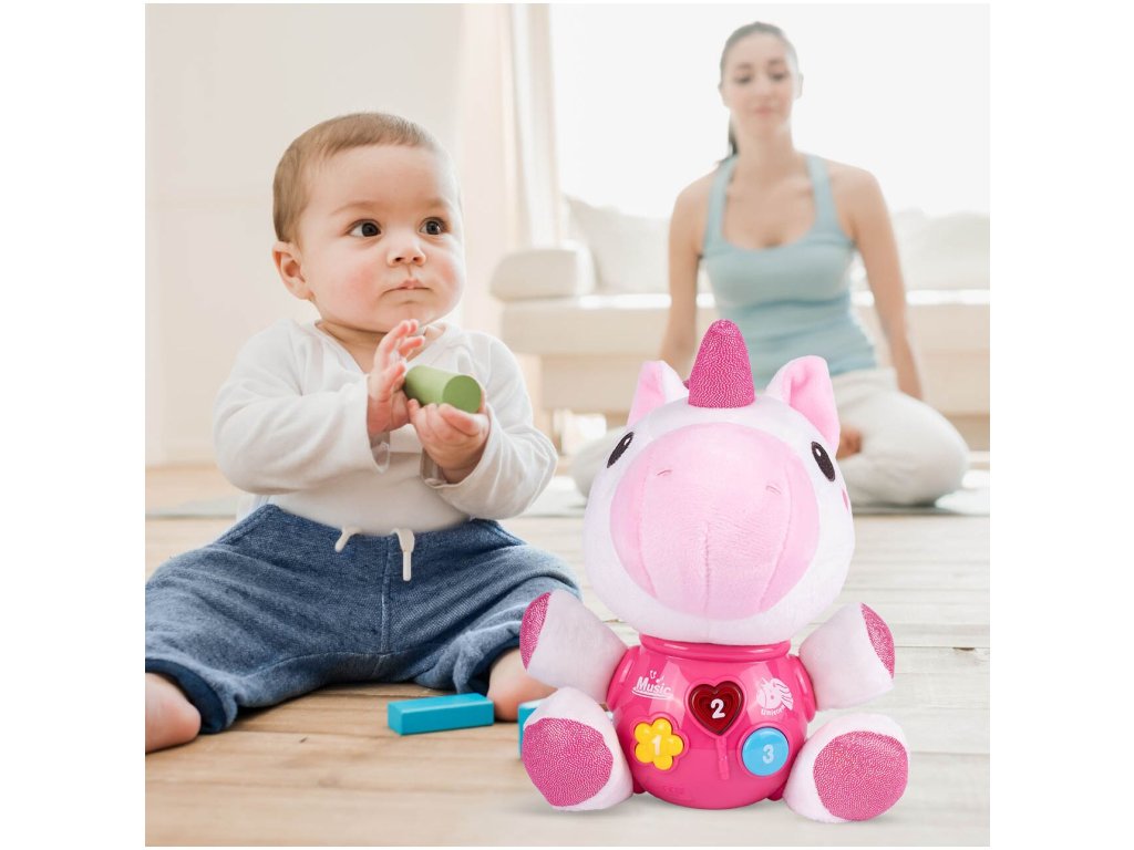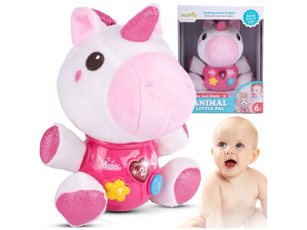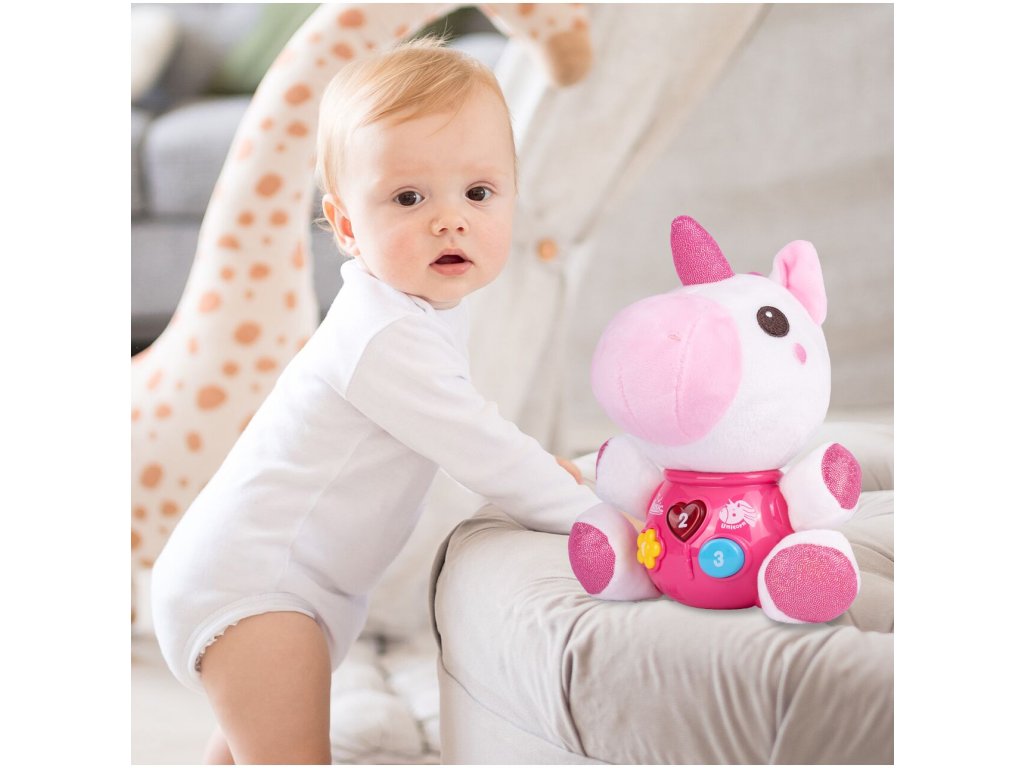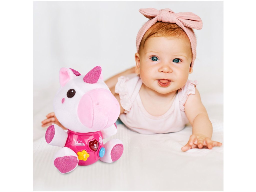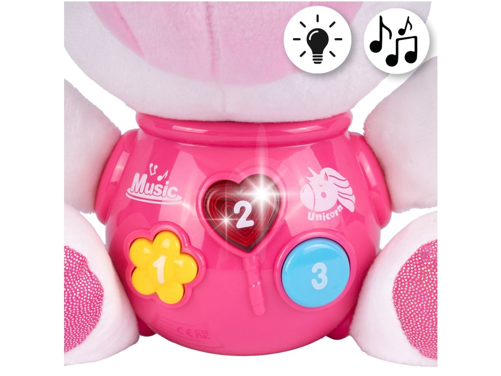 Interaktivní plyšový jednorožec Magic Unicorn je ideální hračkou nejmenší děti. Je vyroben z jemného na dotyk příjemného materiálu. Po zmáčkutí tlačítek se spustí, osvětlení, zvuky a melodie. Hračka je určena pro děti od 6 měsíců věku.